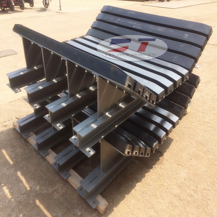 緩沖床主要用于替代緩沖托輥,緩沖床由緩沖條組成,而緩沖條主要應用優良的高彈性特種橡膠層充分有效吸收了物料下落時的沖擊力,大大降低了物料下落時對輸送帶的沖擊,真正的改善了落料點的受力狀況。并采用特殊的UHMW高分子聚乙烯表面,使輸送帶與緩沖條之間的摩擦系數降低,且耐磨性好。緩沖床的使用保證了輸送帶的面與面的接觸,受力均勻,有效了由于托輥斷裂、脫落造成的皮帶縱向撕裂,同時大大降低了皮帶被銳器或尖銳物料穿透后縱向撕裂的概率。緩沖條和輸送帶的面接觸有效了對輸送帶的損傷。輸送帶在落料口受力均勻,大大降低了日常的修補和維護費用 有效消除因輸送帶非均勻受力而導致的物料飛濺及散漏 超高分子量聚乙烯的光滑表面使得輸送帶運行時摩擦降低 聚乙烯層表面的弧形設計 , 保證了輸送帶運行的順滑流暢 超高彈性特種橡膠層能夠吸收物料沖擊力 緩沖條的各部分之間采用熱硫化工藝相連接 , 緊湊牢固 底層鋼結構的設計使得拆裝變得方便快捷 。