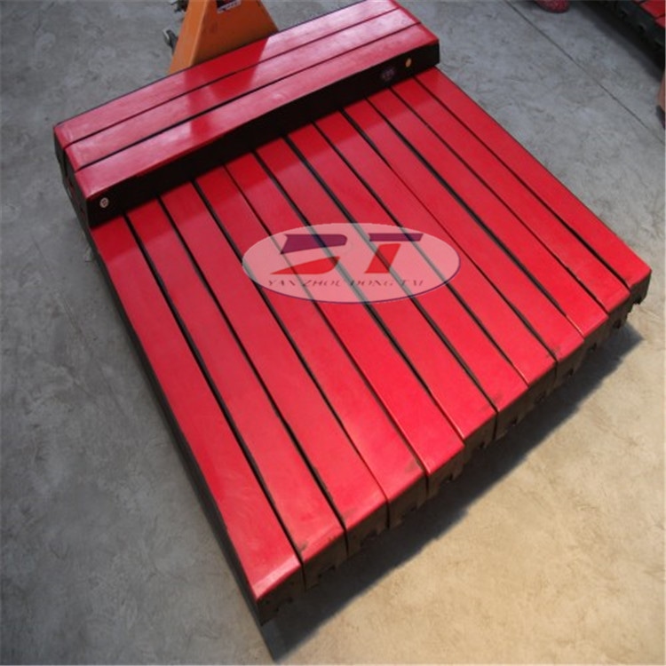 緩沖滑條是緩沖床的重要組成部分,常規的皮帶機落料點保護裝置為緩沖托輥,在生產過程中緩沖托輥的劣勢不斷暴露出來,緩沖托輥與皮帶機接觸是點與面的接觸,受力不均勻,不但不能保護皮帶機還會加重對皮帶機局部造成更嚴重的損傷。由于緩沖托輥之間間距較大 落料容易卡在托輥中間,托輥停止轉動。緩沖滑條又稱緩沖膠條,由高分子聚乙烯板硫化在天然橡膠條上成型。有些聚乙烯板與橡膠條的連接是采用冷粘粘結,這種緩沖條在落料的重擊下會造成脫膠,開裂。