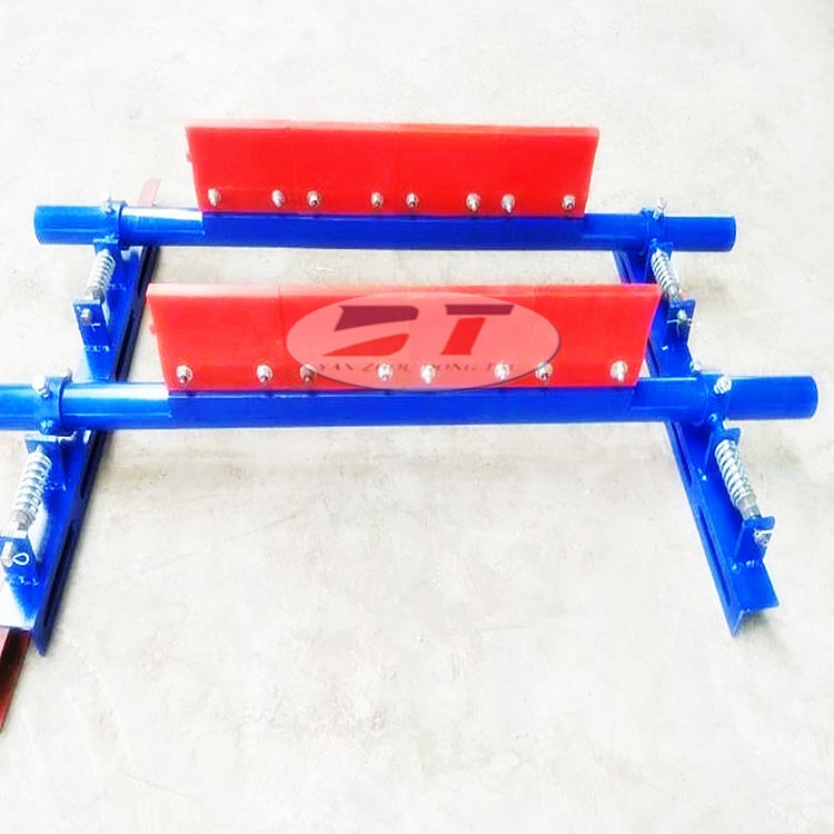 刮刀采用聚氨酯復合材料,利用模具一體加硫成形,刮刀面平整,直線度好,低摩擦、高耐磨、高強度,具有穩定的刮料效果。可有效清除殘留皮帶上之細粒、濕粘物料。預壓式調壓器確保刮刀與皮帶的穩定接觸壓力。刮刀面由多塊窄幅聚氨脂刮板組成,具有空形緩沖孔,對各種皮帶都有良好跟隨性。