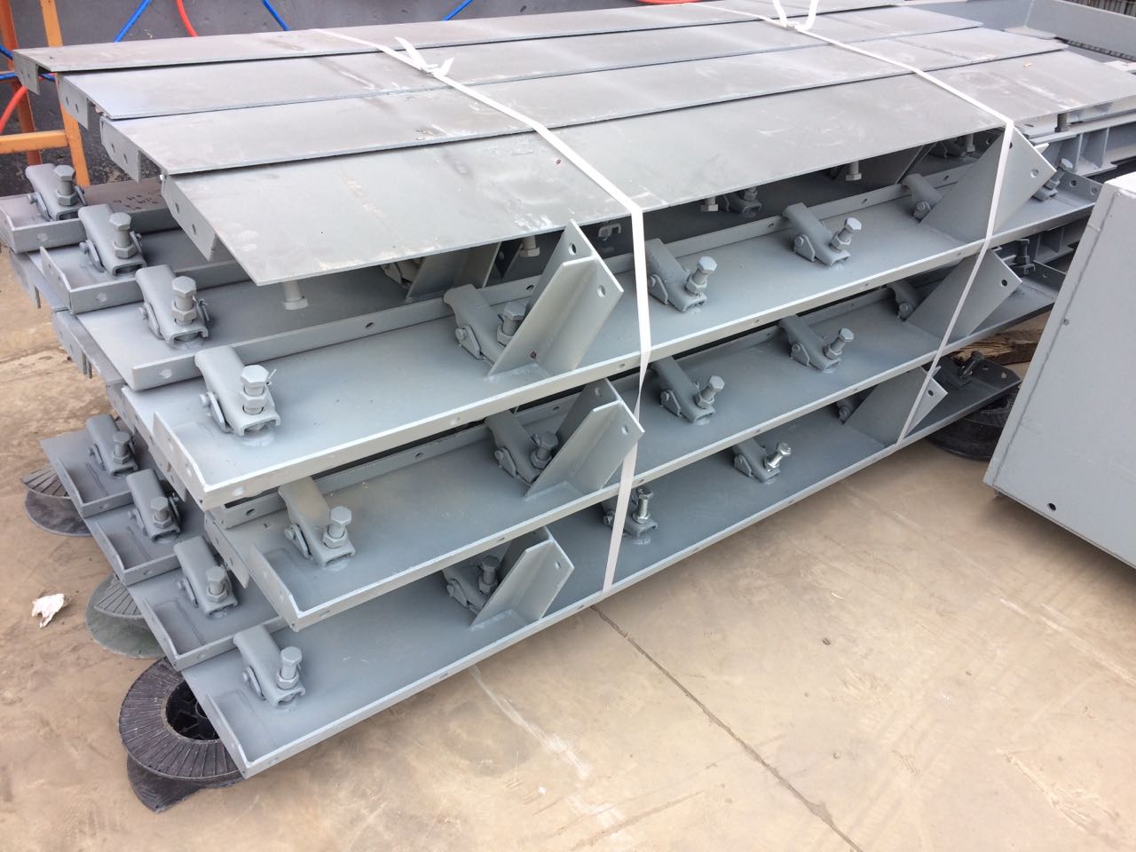 導料槽可分為DTII型和全封閉型;如果是全密封型,由上中下三部分組成,中間側板與輸送機機架連接,為固定部分,上頂蓋及下底板分別同側板通過螺栓連接,可很方便的進行拆卸,以便安裝和維修。兗州東泰導料槽的前后端裝有多道密封擋板和擋簾組成均壓封塵降塵系統,使粉塵得到降壓、減速、沉降,使較干凈氣流在導料槽出口流出。整個導料槽形成封閉式結構,當風塵渦流對導料槽形成沖擊風壓時,粉塵不會四溢擴散。